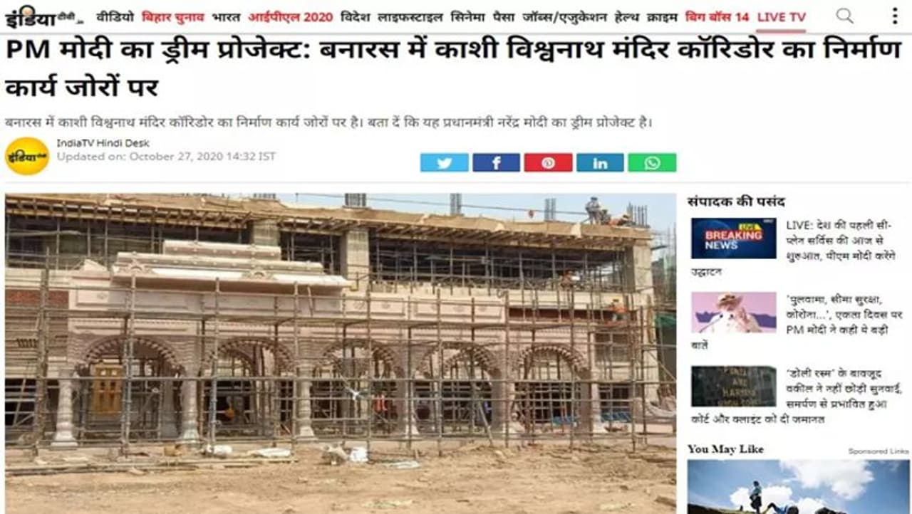 रिवर्स इमेज सर्च की मदद से हमने पाया कि सोशल मीडिया पर वायरल हो रही तस्वीर के साथ छेड़छाड़ की गई है। ये फोटो अयोध्या में बन रहे राम मंदिर की नहीं बल्कि काशी विश्वनाथ मंदिर की है। सर्च करने के बाद हमें हिंदुस्तान टाइम्स का एक आर्टिकल मिला जो 30 अक्टूबर 2020 का है। दोनों में एक ही फोटो का इस्तेमाल किया गया है। एचटी में छपी तस्वीर के साथ कैप्शन लिखा है, “निर्माणाधीन काशी विश्वनाथ मंदिर का मुख्य परिसर”। दोनों फोटो को ध्यान से देखने पर पाया गया कि ये तस्वीरें एक जैसी हैं।