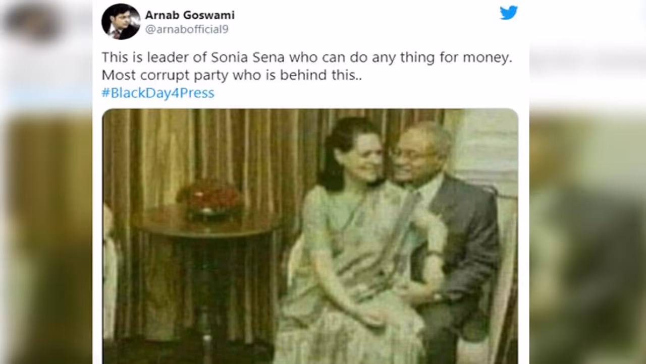 सोनिया गांधी की तस्वीर सोशल मीडिया पर खूब वायरल हो रही है, जिसमें वह मालदीव के पूर्व राष्ट्रपति मौमून अब्दुल गयूम की गोद में बैठी नजर आ रही हैं। इस फोटो को अर्नब गोस्वामी की गिरफ्तारी के खिलाफ नाराजगी के रूप में हैशटैग '#black day for press' के साथ शेयर किया जा रहा है।