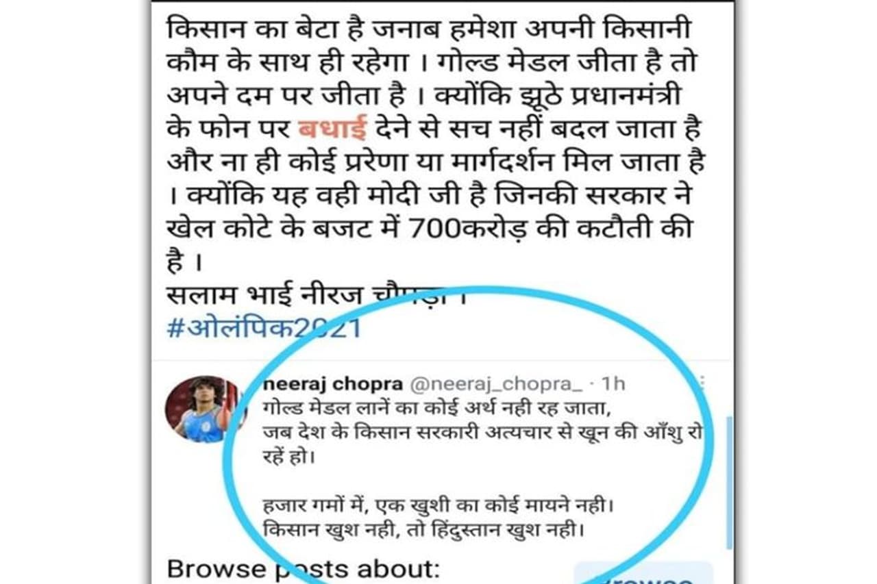 गोल्ड मेडल जीतने वाले नीरज चोपड़ा का एक पोस्ट सोशल मीडिया में वायरल होने लगा। इस हिन्दी ट्वीट में लिखा था अगर देश के किसान सरकार के अत्याचारों से पीड़ित हैं तो पदक जीतने का कोई मतलब नहीं है।