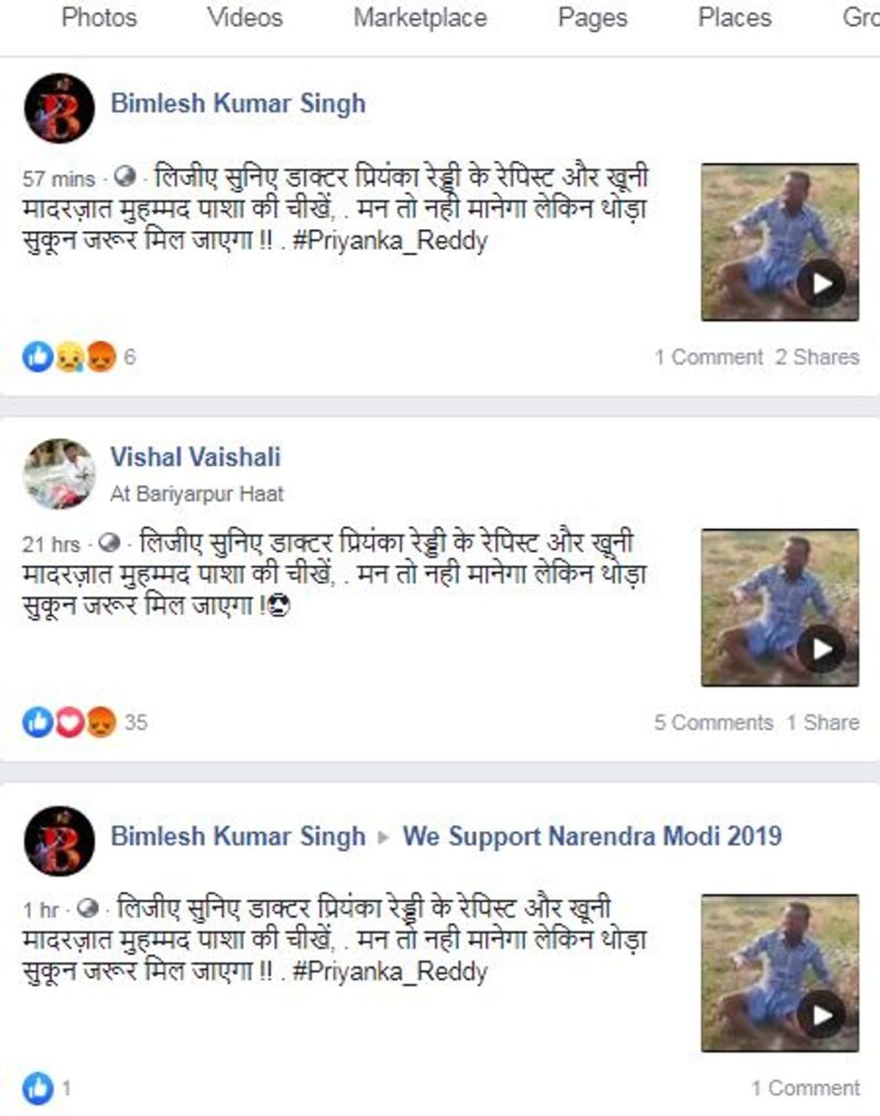 आपको बता दें कि हैदराबाद में हुए इस हादसे के खिलाफ लोगों का गुस्सा फूटा है। देश भर में कई स्थानों विरोध प्रदर्शन भी हुए है। फेसबुक, ट्विटर पर लोग गुस्सा जाहिर कर रहे हैं। वहीं एक पोस्ट में दावा किया जा रहा है कि मुख्य आरोपी मोहम्मद पाशा को पीटते दिखाया जा रहा है। इस वीडियो के साथ लिखा गया- लीजिए सुनिए लेडी डॉक्टर के रेपिस्ट और खूनी मोहम्म्द पासा की चीखें, मन तो नहीं मानेगा लेकिन थोड़ा सुकून मिलेगा।