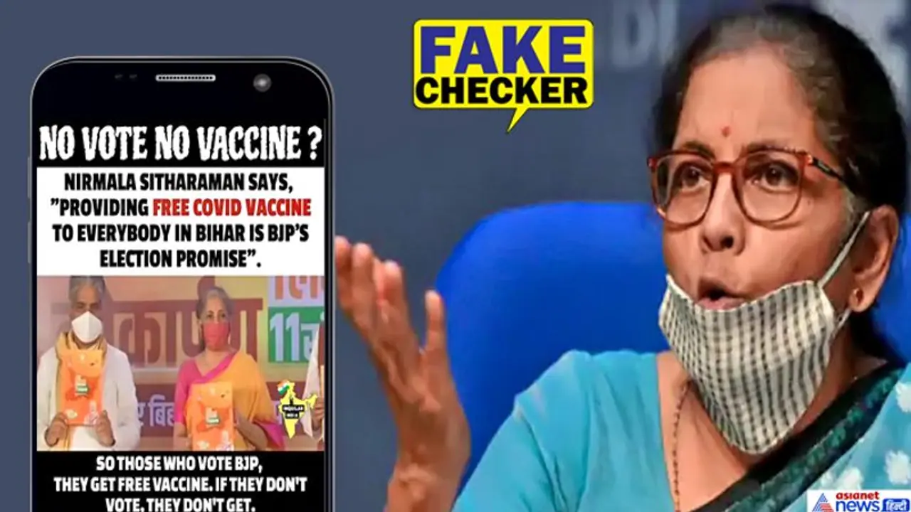 फैक्ट चेक डेस्क. No vote no vaccine bihar Election: बिहार में विधानसभा चुनावों को लेकर सोशल मीडिया पर तरह-तरह की फेक न्यूज वायरल हो रही हैं। राष्ट्रीय जनता दल, भाजपा से लेकर अन्य सभी पार्टियां चुनाव को लेकर मैदान में हैं। बड़े-बड़े वादों के बीच बीजेपी ने बिहारबासियों को कोरोना वैक्सीन मुफ्त देने की घोषणा की थी। अब सोशल मीडिया पर एक पोस्ट जमकर वायरल हो रही है। भाजपा का घोषणापत्र जारी करती वित्त मंत्री निर्मला सीतारमण की तस्वीर के साथ एक पोस्ट सोशल मीडिया पर तैर रही है। इस पोस्ट में दावा किया जा रहा है कि जो लोग भाजपा को वोट नहीं करेंगे उन्हें कोरोना की वैक्सीन मुफ्त में नहीं मिलेगी।
