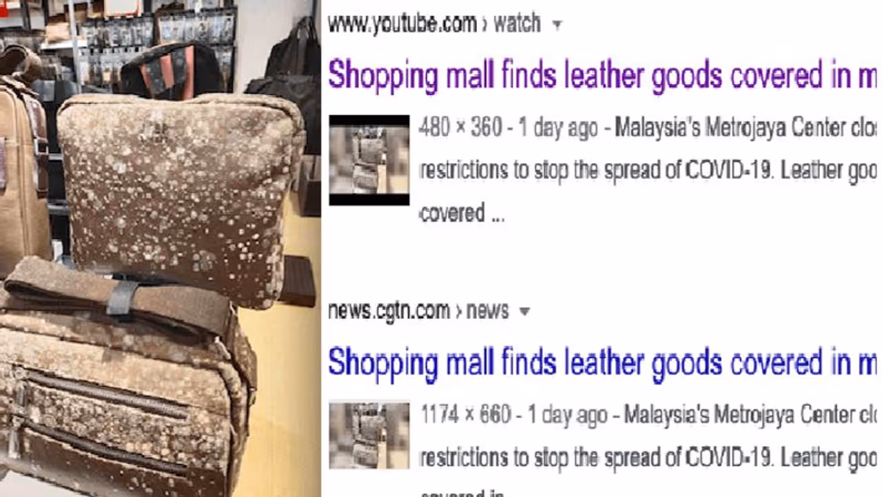 CTNG के इस वीडियो में हमें मेसेज के साथ वायरल हो रहीं सातों तस्वीरें मिलीं। 12 मई को छपे आर्टिकल के मुताबिक़ ये तस्वीरें मलयेशिया के मेत्रोजय सेंटर की हैं. COVID-19 से जुड़े लॉकडाउन के चलते इस मॉल को 18 मार्च से बंद कर दिया गया था। रिपोर्ट्स के मुताबिक़ ह्यूमिडिटी और एयर कंडिशनिंग बंद होने के कारण चमड़े के सामान पर फ़ंगस लग गया था।
