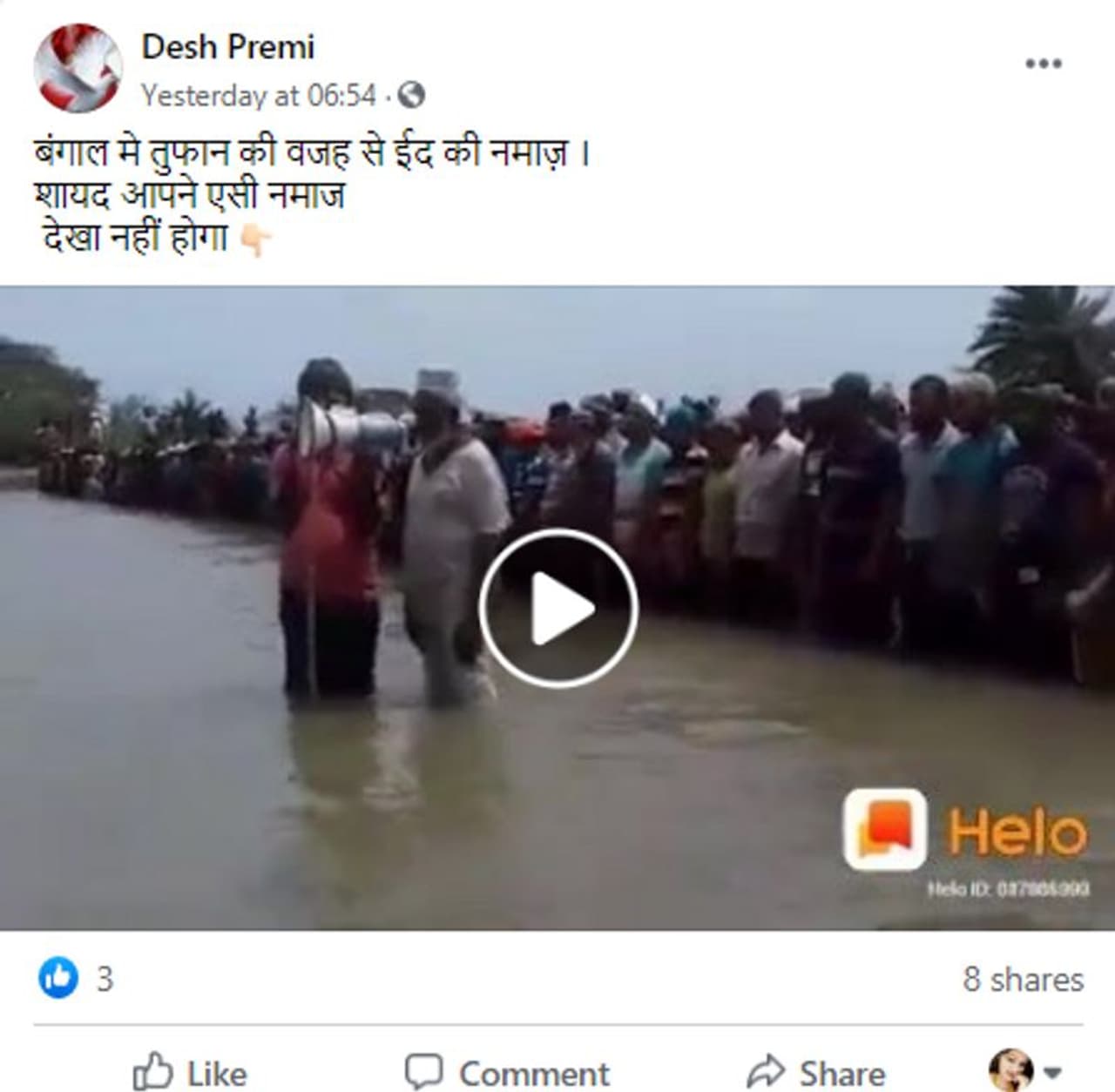 फेसबुक यूजर "Desh premi " ने यह वीडियो शेयर करते हुए कैप्शन में लिखा: "*बंगाल मे तूफान की वजह से ईद की नमाज़..*…"