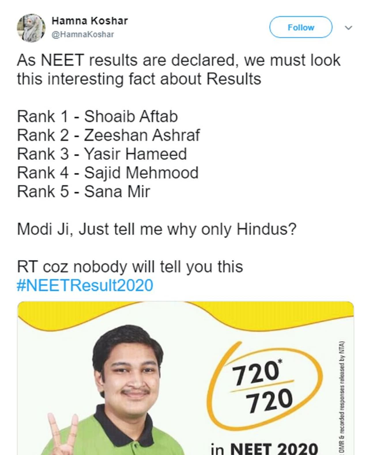 वायरल पोस्ट में लिखा है, “नीट परीक्षा के नतीजे आ चुके हैं, हमें नतीजों से जुड़े रोचक पहलुओं पर गौर करना चाहिए- रैंक 1. शोएब आफताब, रैंक 2. जीशान अशरफ, रैंक 3. यासिर हमीद, रैंक 4. साजिद महमूद, रैंक 5. सना मीर...मोदी जी, हमें बताइये कि हमेशा हिंदुओं के साथ ही इस तरह का अन्याय क्यों होता है?”
