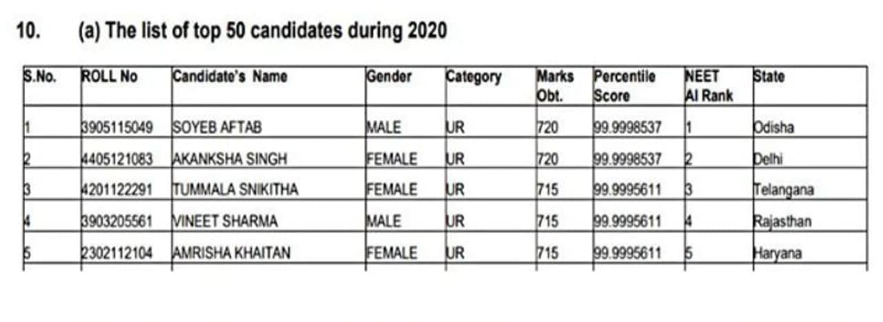 इस साल नीट की परीक्षा 13 सितंबर को अयोजित हुई थी। इसमें ओडिशा के शोएब आफताब 720 में से 720 अंक पाकर ऑल इंडिया टॉपर रहे। दिल्ली की आकांक्षा सिंह ने भी 720 में से 720 अंक पाए, लेकिन नियमों के हिसाब से उन्हें दूसरी रैंक मिली, क्योंकि वह आफताब से उम्र में छोटी हैं।
