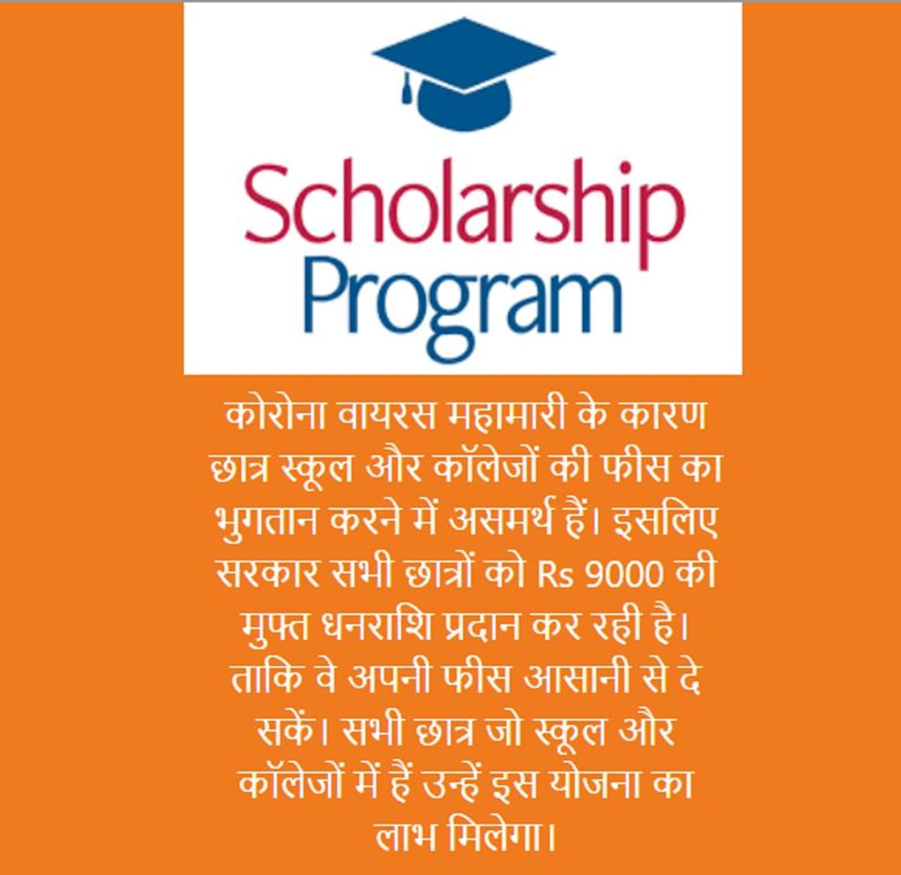 वायरलमैसेज में लिखा है, ‘कोरोना वायरस महामारी के कारण छात्र स्कूल और कॉलेजों की फीस का भुगतान करने में असमर्थ हैं। इसलिए सरकार सभी छात्रों को Rs 9000 की मुफ्त धनराशि प्रदान कर रही है। ताकि वे अपनी फीस आसानी से दे सकें। सभी छात्र जो स्कूल और कॉलेजों में हैं उन्हें इस योजना का लाभ मिलेगा। आप इस लिंक से अपनी Rs 9000 की मुफ्त धनराशि प्राप्त करने के लिए फ़ॉर्म भर सकते हैं| 👉http://bit.ly/Register-For-Free-Scholarship🙏🙏 निवेदन: 🙏 लोगो की सुविधा के लिए इस संदेश को ज्यादा से ज्यादा शेयर करें जिससे उन्हें इस सुविधा का लाभ मिल सके।’ वॉट्सऐप पर वायरल इस मैसेज को यहां ज्यों का त्यों पेश किया गया है।