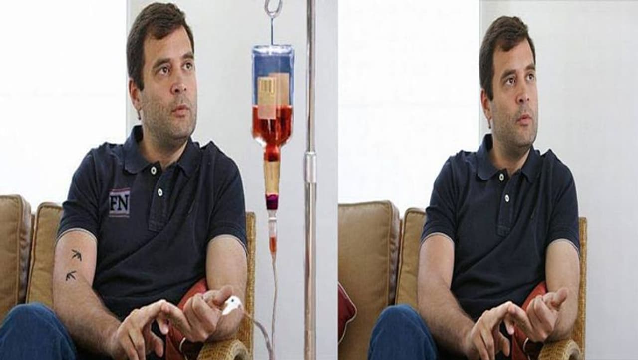 तस्वीर में राहुल सोफे पर बैठे हैं और उनके बगल में ग्लूकोज या खून की बोतल टांगने के लिए इस्तेमाल होने वाला स्टैंड रखा नजर आ रहा है। स्टैंड पर खून की बोतल टंगी है जिसकी नली राहुल के हाथ में लगी दिख रही है।