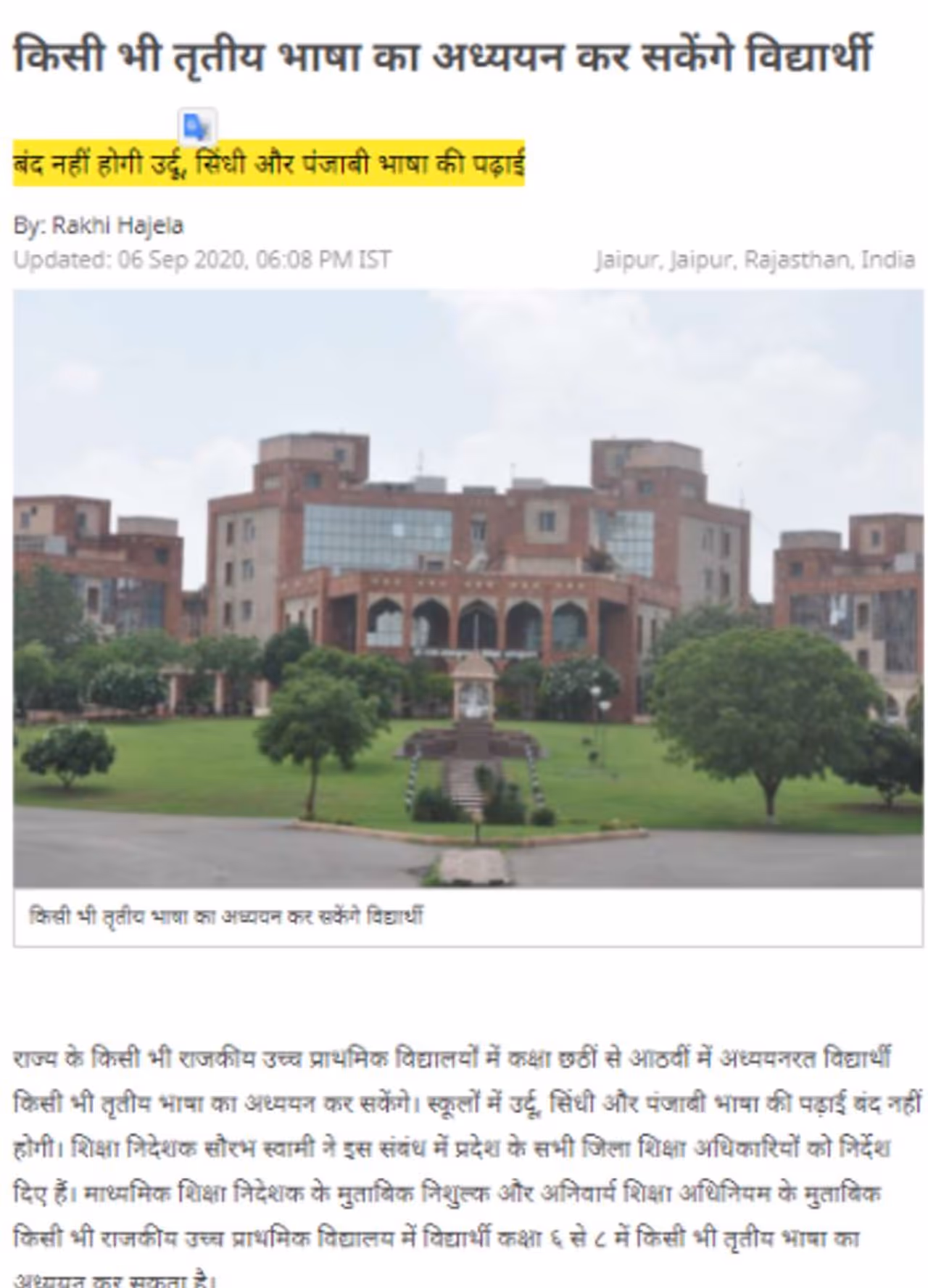 फैक्ट चेक डेस्क. सोशल मीडिया पर दावा किया जा रहा है कि राजस्थान के स्कूलों में हिंदी, उर्दू व पंजाबी भाषा की पढ़ाई बंद होगी। वायरल मैसेज के साथ एक खबर की कटिंग भी शेयर की जा रही है। इस खबर के अनुसार, नई शिक्षा नीति में एक तरफ जहां थ्री लैंग्वेज फॉर्मूले की बात हो रही है। वहीं, राजस्थान के सरकार स्कूलों में तीन अहम भाषाओं की पढ़ाई बंद हो रही है।