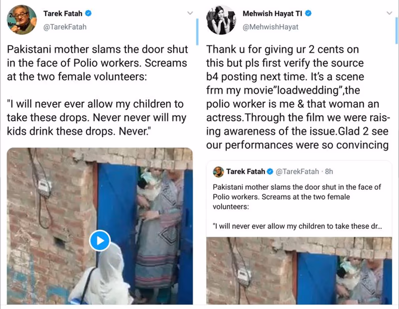 फतेह ने 42 सेकंड की क्लिप में शेयर की जिसमें एक महिला घर-घर जाकर पोलियो ड्रॉप पिलाने वालों पर बरस रही है। वह पोलियो ड्रॉप पिलाने से इनकार कर देती है और पोलियो ड्रॉप के बदले राशन देने की डिमांड करने लगती है। पाकिस्तानी मां ने पोलियो कर्मियों के चेहरे पर दरवाजा बंद कर कर देती है। वो दो महिला स्वयंसेवकों पर चिल्लाती है, "मैं कभी भी अपने बच्चों को ये बूंदें पीने नहीं दूंगी। कभी भी मेरे बच्चे इन बूंदों को नहीं पीएंगे। कभी नहीं।"