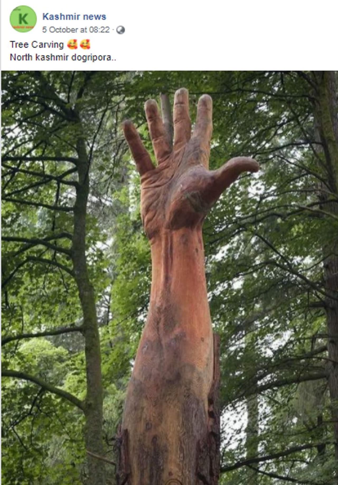 फेसबुक पर इस पोस्ट को ‘Kashmir News’ नामक पेज ने साझा किया है। पोस्ट में हाथ की शेप में एक पेड़ नजर आता है। पोस्ट के साथ अंग्रेजी में कैप्शन लिखा गया है जिसका हिंदी अनुवाद है—पेड़ नक्काशी उत्तर कश्मीर डोगरीपोरा पोस्ट का आर्काइव्ड वर्जन यहां देखा जा सकता है।