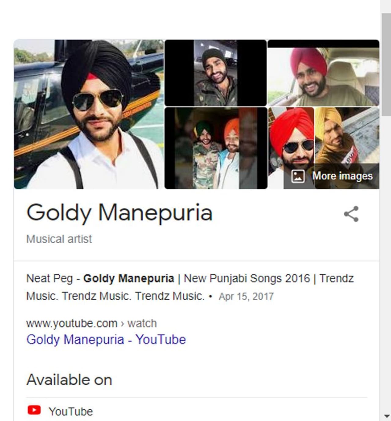 यूट्यूब पर सर्च करने पर हमें गोल्डी मानपुरिया के नाम कई वीडियो मिले। गोल्डी मनेपुरिया एक पंजाबी सिंगर है हालांकि वो काफी फेमस नहीं है। उन्होंने बीपीएल कार्ड (BPL) और नीट पैग (NEAT PEG) जैसे कुछ पंजाबी गाने रिलीज़ किए हैं, जिन्हें उन्होंने अपने सोशल मीडिया अकाउंट्स पर प्रमोट भी किया था।