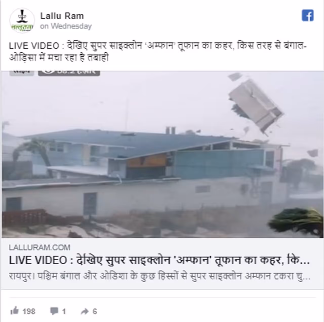 फेसबुक पेज "Lallu Ram" ने अपनी ही वेबसाइट पर प्रकाशित हुए एक आर्टिकल का लिंक डाला जिसमें यह वीडियो भी शामिल था। वीडियो के साथ कैप्शन लिखा गया है: "LIVE VIDEO : देखिए सुपर साइक्लोन ‘अम्फान’ तूफान का कहर, किस तरह से बंगाल-ओडिशा में मचा रहा है तबाही"