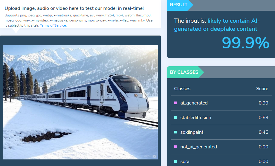 इसके बाद, हाइव मॉडरेशन जैसे एआई फोटो डिटेक्शन टूल से जांच करने पर पुष्टि हुई कि वायरल वंदे भारत की तस्वीर एआई द्वारा बनाई गई है।
