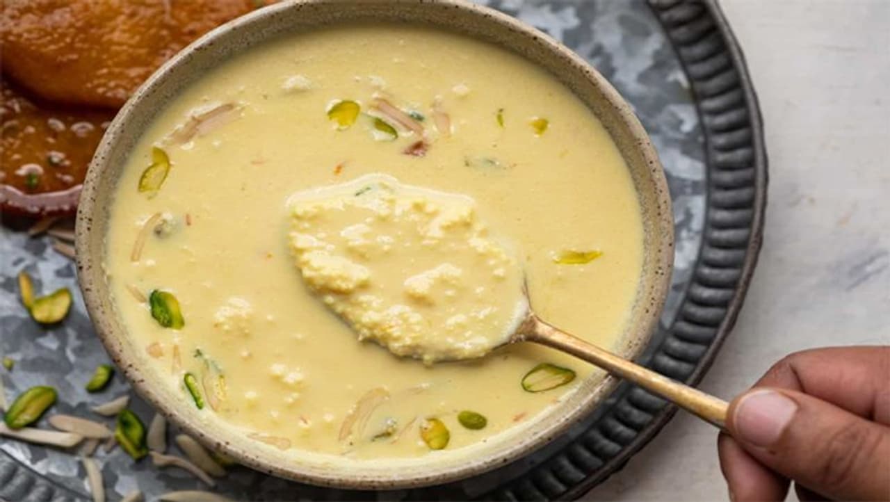 एक और पैन लें और उसमें दूध लेकर तबतक पका लें, जब तक यह 1/4 भाग तक कम न हो जाए। याद रखें कि दूध को लगातार चलाते रहें, नहीं, तो ये जल सकता है। जब दूध गाढ़ा हो जाए, तो इलायची पाउडर और पैन को आंच से हटा दें। आपकी रबड़ी तैयार है। (अगर आप जल्दी में हैं तो आप कंडेंस्ड मिल्क का भी इस्तेमाल कर सकते हैं।)