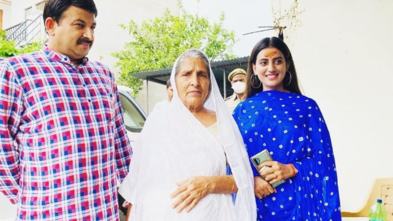 सोशल मीडिया पर शेयर की गई फोटो में मनोज तिवारी सिंपल लुक और कुर्ता पायजामा में नजर आ रहे हैं। वहीं, अक्षरा सिंह माथे पर तिलक लगाए सूट-सलवार और खुले बाल में दिखाई दे रही हैं। इसमें एक ही फ्रेम में मनोज तिवारी की मां भी नजर आ रही हैं।