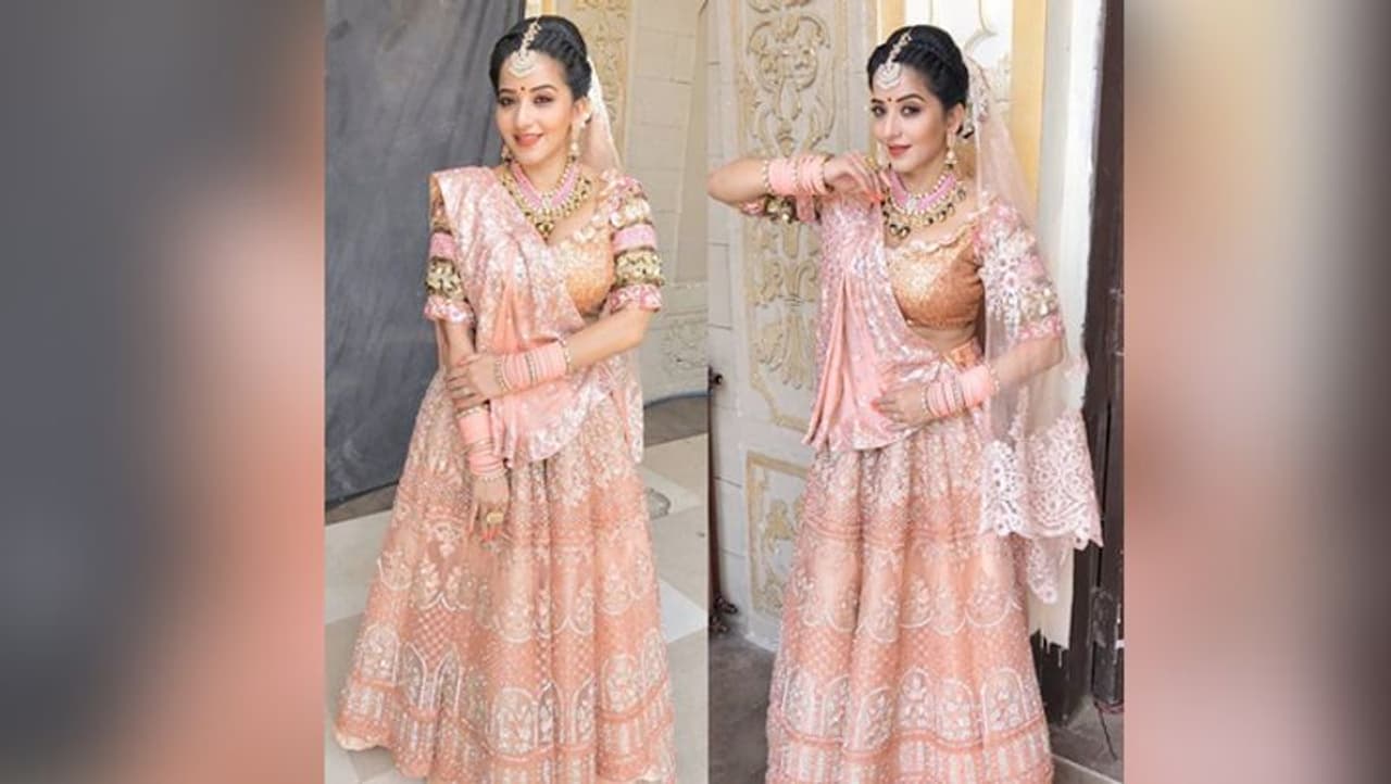 इन फोटोज में मोनालिसा ने मांग टीका, हैवी नेकलेस, हाथ में चूड़ा और लाइट ऑरेंज कलर में लहंगा कैरी किया था। इसके साथ उन्होंने इस दौरान न्यूड मेकअप किया था।
