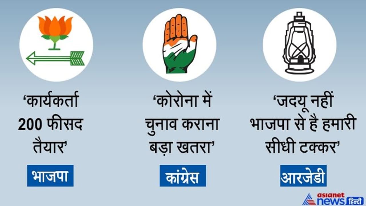 बताते चले कि बिहार विधानसभा चुनाव इस बार तीन चरणों में होगा। चुनाव आयुक्त सुनील अरोड़ा ने कहा है कि 28 अक्टूबर को पहले चरण की वोटिंग होगी, जबकि 3 नवंबर को दूसरे चरण और 7 नवंबर को तीसरे चरण की वोटिंग होगी। इसके बाद 10 नवंबर को चुनाव के नतीजे आएंगे। बिहार की 243 सदस्यीय विधानसभा का कार्यकाल 29 नवम्बर को समाप्त होगा। अब आइये जानते हैं किस दल ने क्या कहा।