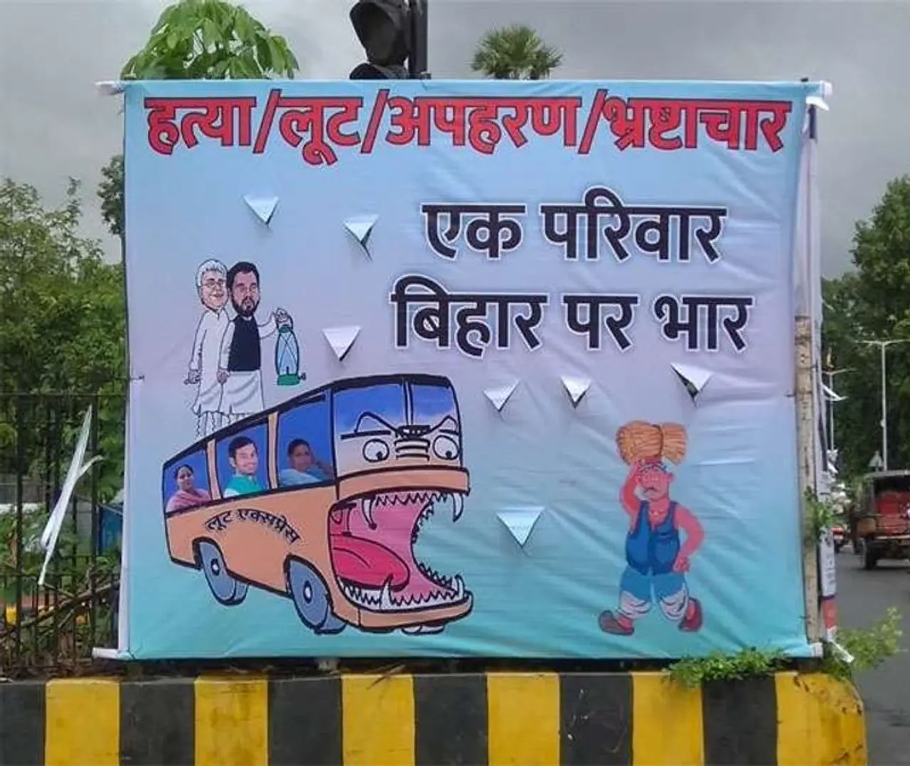 बस की छत पर लालटेन लेकर लालू व तेजस्वी यादव (Tejashwi Yadav) खड़े हैं तो अंदर तेज प्रताप यादव, राबड़ी (Rabri Devi) और मीसा भारती (Misa Bharti) हैं। होर्डिंग पर लिखा है- एक परिवार, बिहार पर भार।