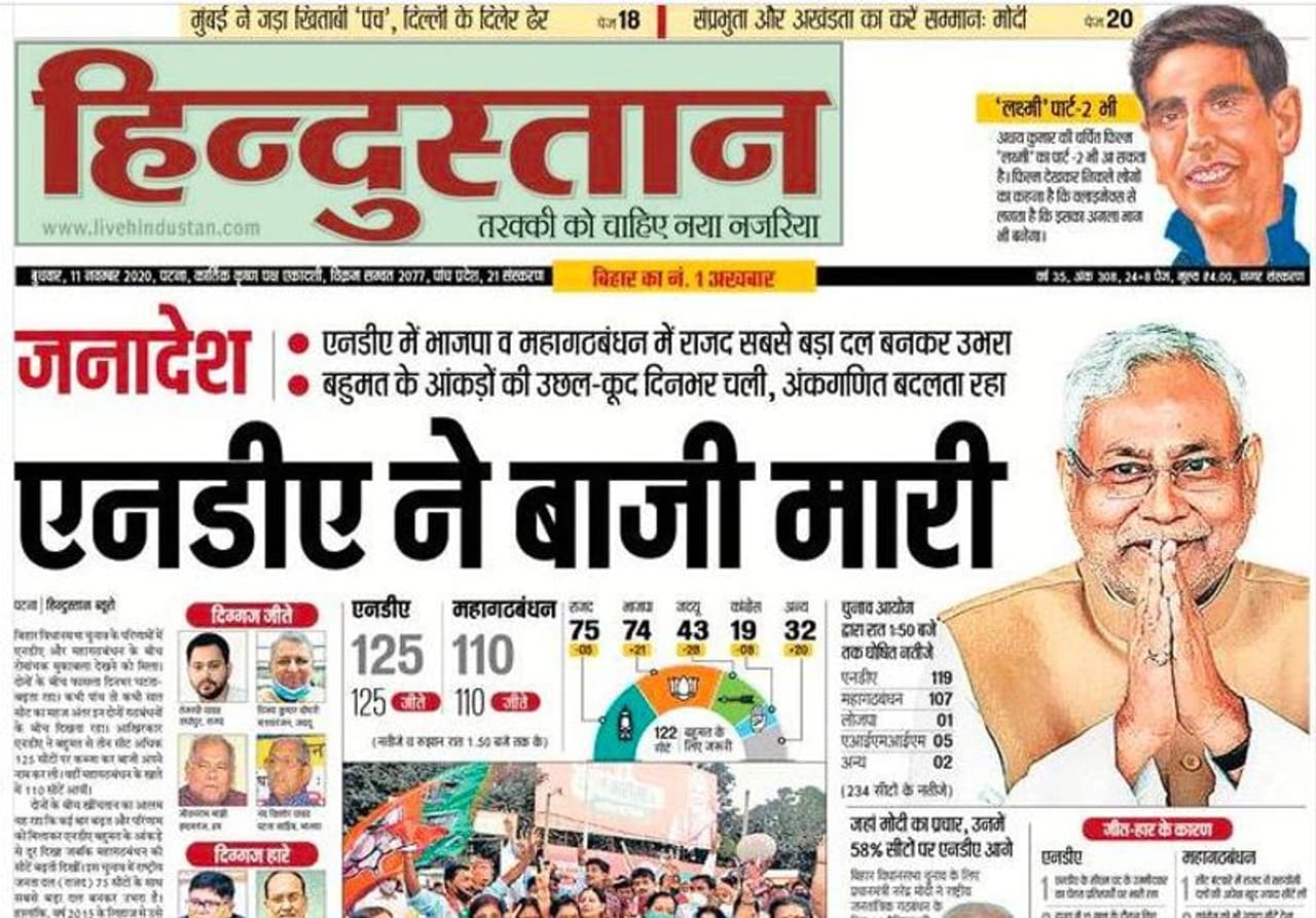 अखबार ने नीतीश कुमार की बड़ी फोटो के साथ लिखा- एनडीए ने बाजी मारी। इसके अलावा यह भी लिखा कि एनडीए में भाजपा और महागठबंधन में राजद सबसे बड़ी पार्टी बनी। साथ ही अखबार ने चुनाव जीतने वाले बड़े चेहरों की फोटो भी लगाई।