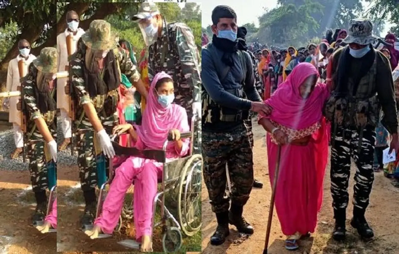 बिहार में दिव्यांग मतदाताओं की मदद करते जवान। साथ में सोशल डिस्टेसिंग और कोरोना के गाइड लाइन सुनिश्चित कराते पालन।