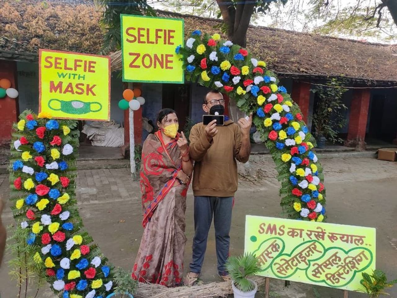 बिहार में एक बूथ पर बने सेल्फी प्वाइंट पर मतदान करने के बाद अपनी सेल्फी लेते पति-पत्नी।
