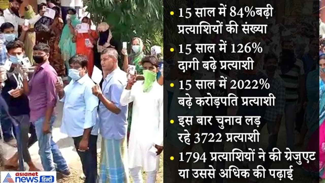 पिछले 15 साल में 84 प्रतिशत प्रत्याशियों की संख्या बढ़ी है। आंकड़ों पर नजर करें तो साल 2005 में 2027 प्रत्याशी चुनावी मैदान में थे, जबकि साल 2010 के चुनाव में 3292 और पिछले इलेक्शन में 3401 उम्मीदवार थे, जबकि इस बार 3722 प्रत्याशी विधानसभा चुनाव लड़ रहे हैं।