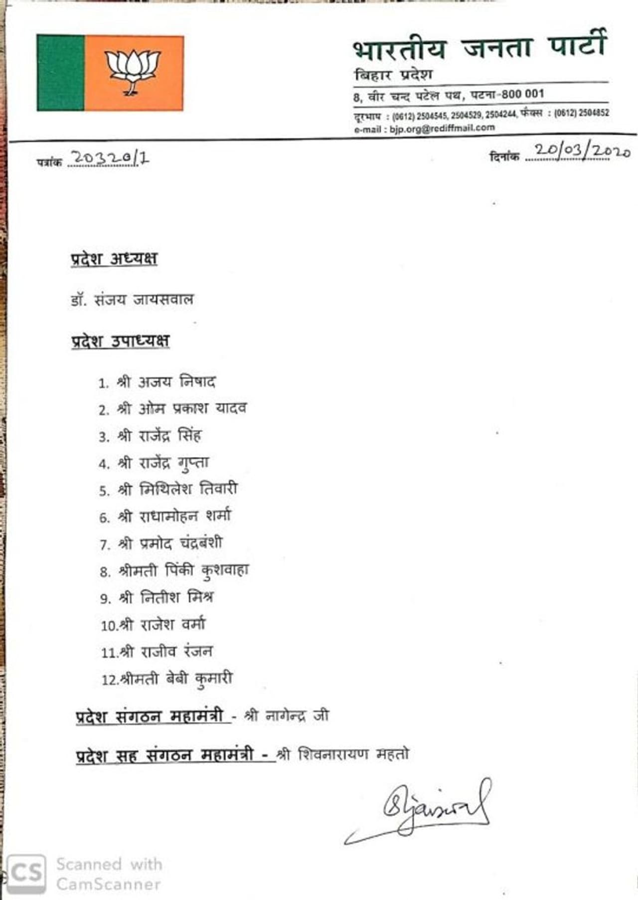 पटना. आगामी विधनसभा चुनावों के मद्देनजर बिहार भाजपा ने अपनी नई टीम बना ली है। इसके तहत राज्य में 12 लोगों को प्रदेश उपाध्यक्ष बनाया है। बिहार भाजपा के अध्यक्ष संजय जायसवाल ने नई टीम का एलान किया है। इसमें अजय निषाद, ओम प्रकाश यादव, राजेंद्र सिंह, राजेंद्र गुप्ता, मिथिलेश तिवारी, राधा मोहन शर्मा, प्रमोद चंद्रवंशी, पिंकी कुशवाहा, नीतीश मिश्रा, राजेश वर्मा, राजीव रंजन, बेबी कुमारी शामिल हैं।