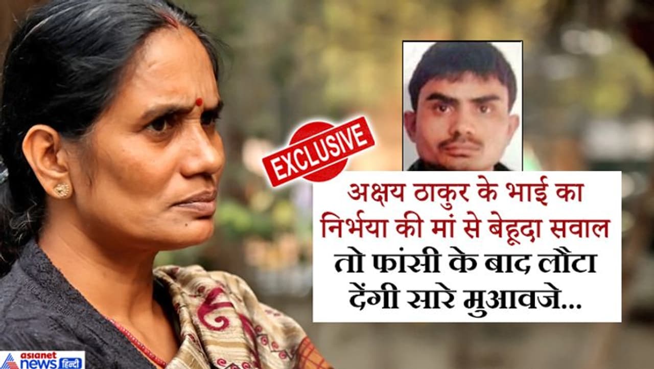 दोषियों को जल्द से जल्द फांसी देने पर निर्भया की मां अड़ी हुई हैं। अक्षय के भाई ने उनसे पूछा, "दूसरी सजा भी दी जा सकती है। जब यह दुखद घटना हुई तो सरकार ने उन्हें (निर्भया के घरवालों को) मुआवजा दिया था। लेकिन अब जब सभी को फांसी ही हो जाएगी तो क्या निर्भया का परिवार मुआवजा लौटा देगा?"