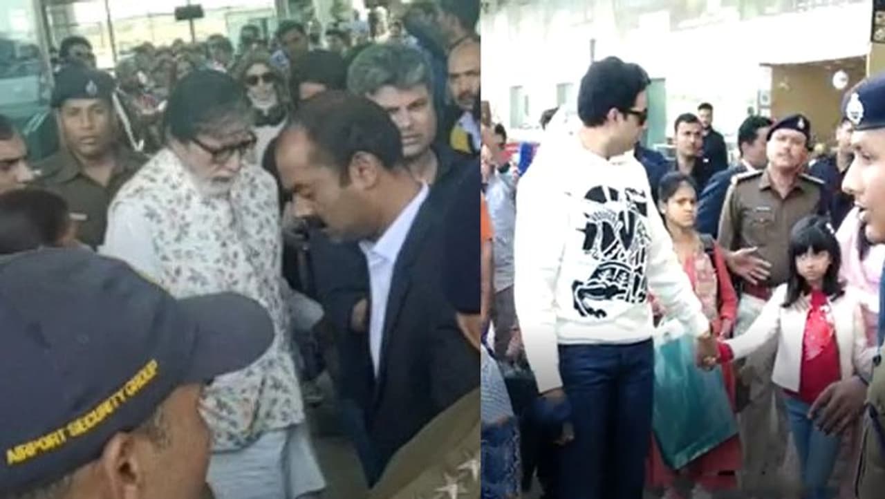 एयरपोर्ट पर भीड़ में घिरे अमिताभ बच्चन।