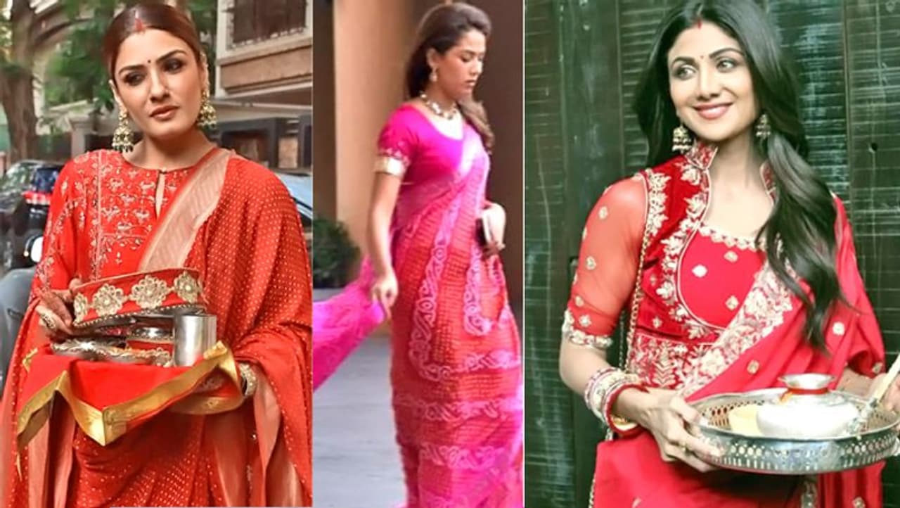 मांग में सिंदूर, हाथों में पूजा की थाली, करवा चौथ पर दुल्हन की तरह सजीं शिल्पा-रवीना: PHOTOS