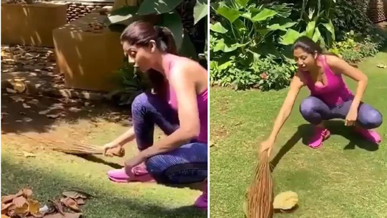 गार्डन में झाड़ू लगाते शिल्पा शेट्टी। इसे एक्सरसाइज का बताया हिस्सा।