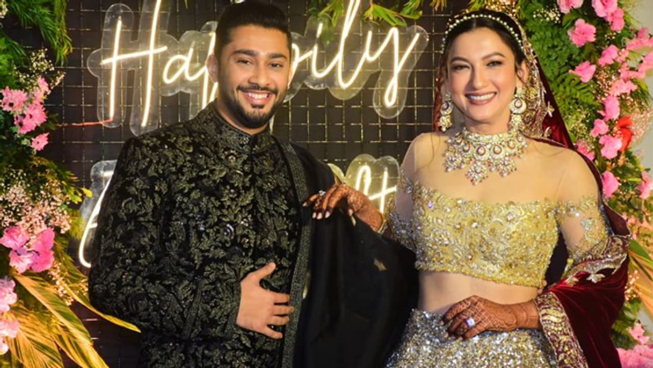 गोल्डन-महरून लहंगे में बेहद खूबसूरत दिखीं गौहर खान, रिसेप्शन पार्टी में हाथों में हाथ डाले दिखा कपल