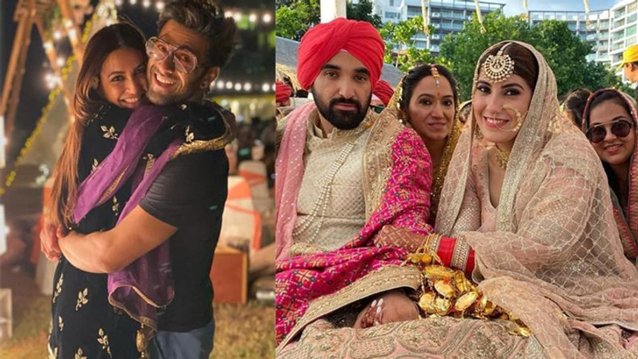 दुल्हन बनी फ्रेंड निहारिका को गले लगाती कीर्ति खरबंदा।