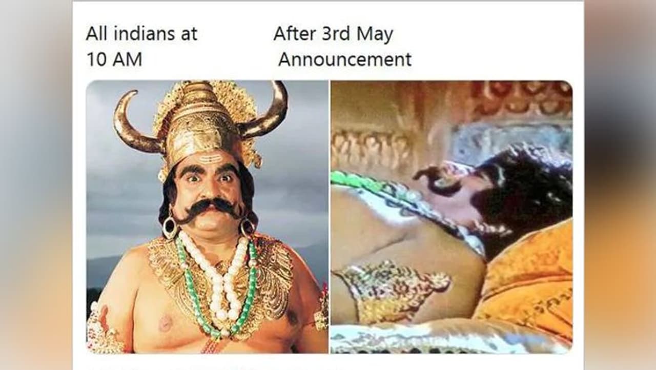 इन दिनों रामानंद सागर की रामायण का दूरदर्शन पर पुनः प्रसारण हो रहा है। ऐसे में इसके किरदारों से बने मीम्स खूब बन रहे हैं। लॉकडाउन बढ़ने का ऐलान होते ही कुंभकर्ण वाला ये मीम वायरल हो रहा है।