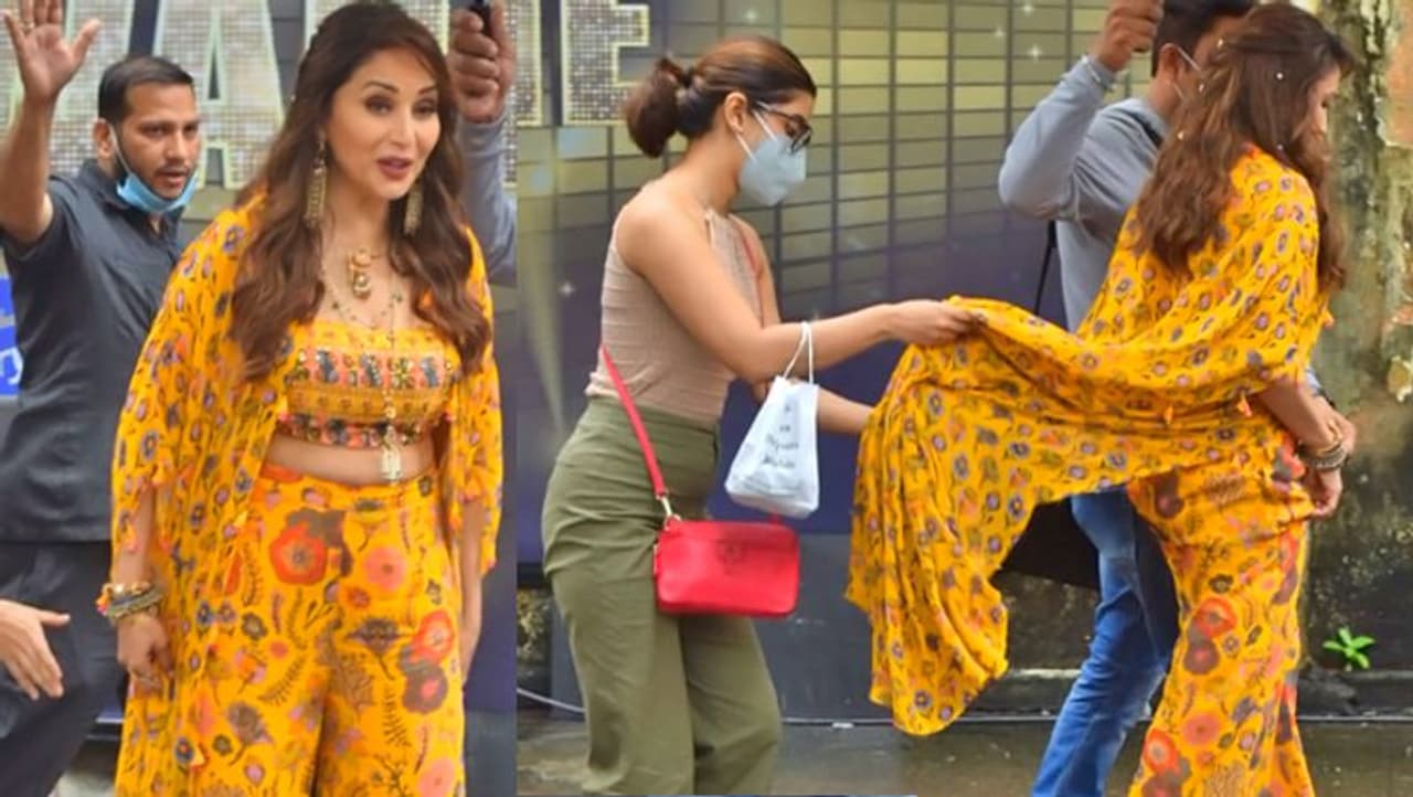 मुंबई। माधुरी दीक्षित (Madhuri Dixit) सोमवार को फिल्मिस्तान स्टूडियो में डांस दीवाने (Dance Deewane) के सेट पर नजर आईं। इस दौरान माधुरी ने यलो कलर की फ्लोरल प्रिंट वाली ढीली-ढाली ड्रेस पहनी थी। हालांकि, वो इस ड्रेस में बेहद खूबसूरत लग रही थीं। माधुरी दीक्षित जब सेट पर कैमरे के सामने पोज दे रही थीं, तभी कुछ ऐसा हुआ कि उन्हें अपनी ड्रेस उठाकर वहां से भागना पड़ा। आखिर क्यों माधुरी को भागना पड़ा..