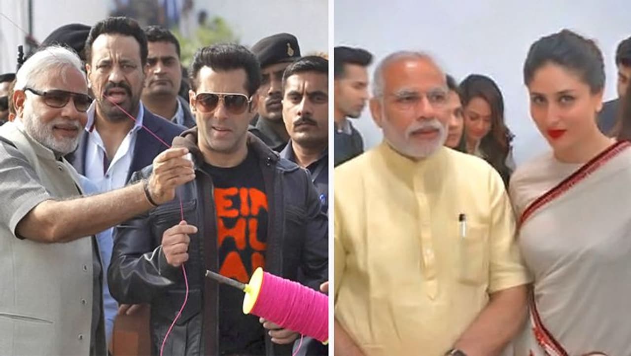 अहमदाबाद में मकर संक्रांति के मौके पर सलमान के साथ पतंग उड़ाते मोदी। दूसरी ओर मुंंबई में एक हॉस्पिटल के उद्घाटन के दौरान करीना कपूर के साथ मोदी।