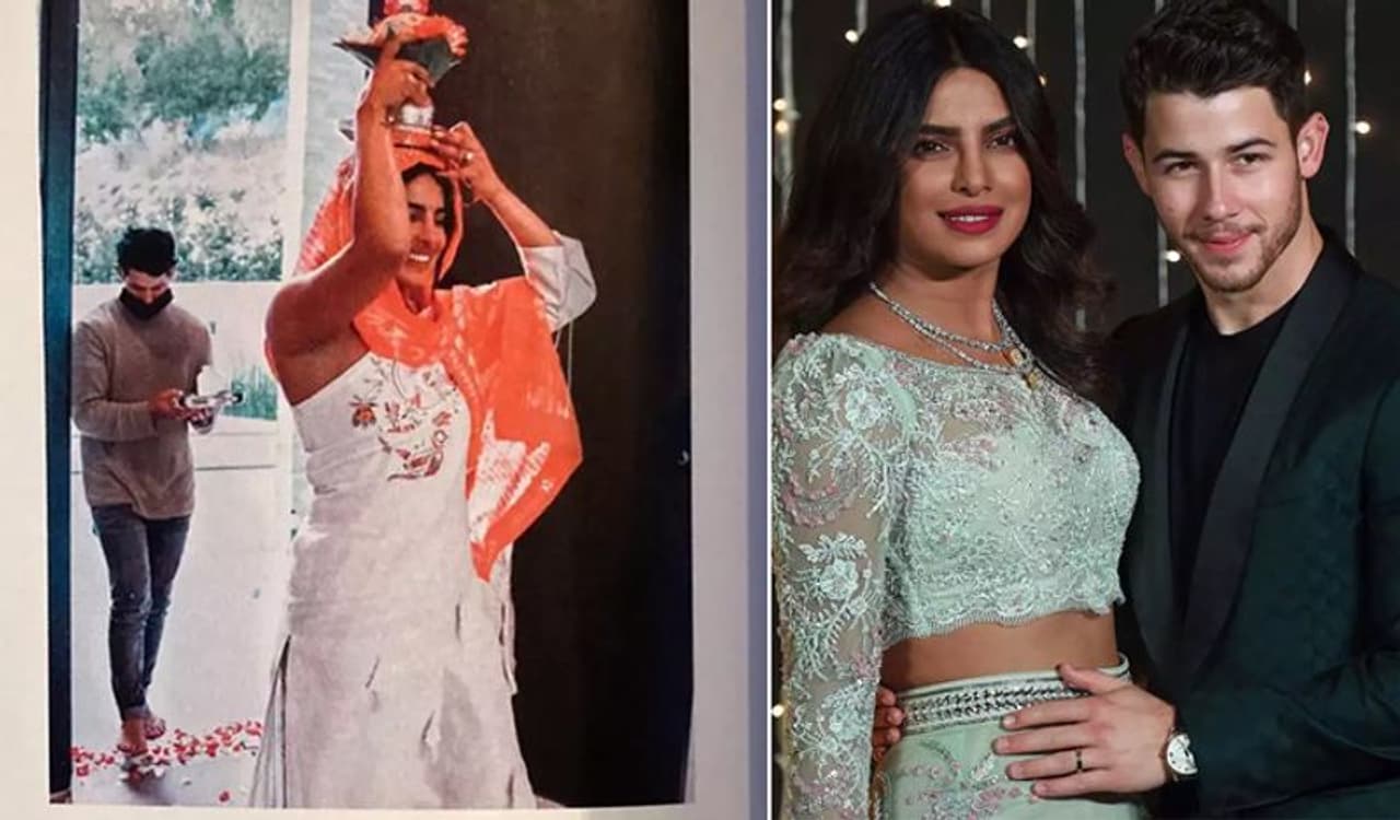 गृह प्रवेश वाली इस तस्वीर में जहां प्रियंका सिंगल स्लीव्स कुर्ते और सिर पर दुपट्टा, माथे पर कलश लिए नजर आ रही हैं। उनके पीछे निक नजर आ रहे है और उनके हाथ में थाली है।