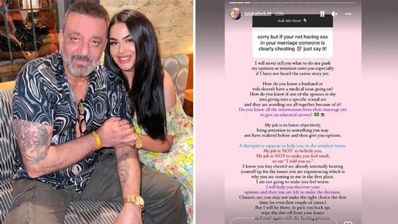 एंटरटेनमेंट डेस्क. संजय दत्त (Sanjay Dutt) की बेटी त्रिशाला दत्त (Trishala Dutt) अपने खुले विचारों के लिए जानी जाती हैं। वे फिजियोथेरेपिस्ट हैं और अक्सर सोशल मीडिया के जरिए लोगों को उनकी मुश्किलों के हल देती रहती हैं। बुधवार को उन्होंने सोशल मीडिया पर आस्क मी नाउ सेशन होस्ट किया। इस दौरान त्रिशाला ने सेक्स और मैरिज को लाइफ को लेकर बात की। बातचीत के दौरान एक यूजर ने लिखा, "माफ़ कीजिए, लेकिन अगर आपकी शादीशुदा जिंदगी में सेक्स नहीं है तो स्पष्ट है कि सामने वाला आपको धोखा दे रहा है।" नीचे की स्लाइड्स में पढ़ें त्रिशाला ने अपने इस क्लाइंट को क्या जवाब दिया...