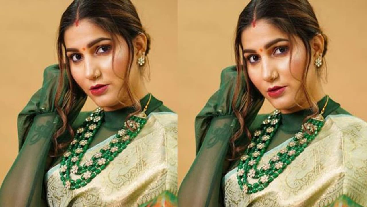 सपना चौधरी साड़ी के साथ ग्रीन कलर का हैवी नेकलेस भी पहने हुए नजर आ रही हैं। जो उनके लुक पर परफेक्टली मैच हो रहा है। इसके साथ ही छोटा सा एयरिंग पहन रखा है।