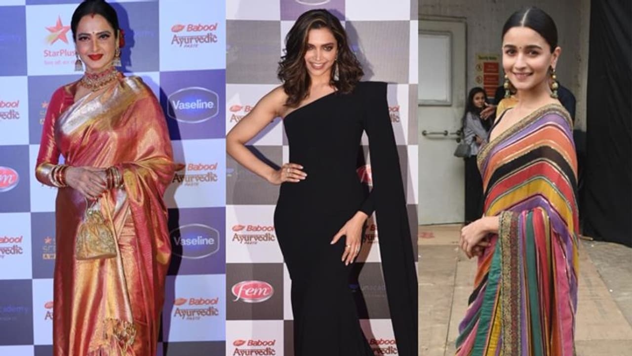 मुंबई. बीती रात मुंबई में स्टार स्क्रीन अवॉर्ड्स का आयोजन किया गया। अवॉर्ड्स शो के रेड कारपेट पर कई बॉलीवुड एक्ट्रेसेस स्टाइलिश और ग्लैमरस लुक में नजर आईं। इवेंट में 65 साल की रेखा ट्रेडिशनल लुक में दिखीं। रेखा ने माथे पर बड़ी बिंदी, हैवी नेकलेस, गोल्डन ईयररिंग्स और हाथों में भरी-भरी चूड़ियां पहन रखी थी। उनका ओवरऑल लुक बेहतरीन लगा। इतना ही नहीं वे आजकल की एक्ट्रेसेस को स्टाइल और लुक के मामले में मात देती नजर आईं। रेखा के अलावा दीपिका पाजुकोण ब्लैड वन शोल्जर गाउन में नजर आईं। उन्होंने हाल ही में हेयरकट करवाया है। आलिया भट्ट लहरिया साड़ी में नजर आई।