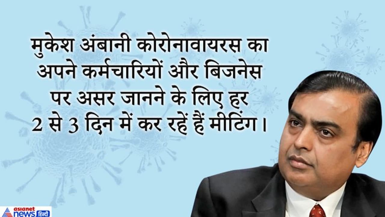 इन सबसे निपटने के लिए रिलायंस इंडस्ट्रीज के चेयरमैन मुकेश अंबानी लगभग एक महीने से अपने पांच लाख कर्मचारियों और व्यापार पर कोरोनावायरस के असर का जायजा लेने के लिए हर दूसरे-तीसरे दिन एक मीटिंग कर रहे हैं।