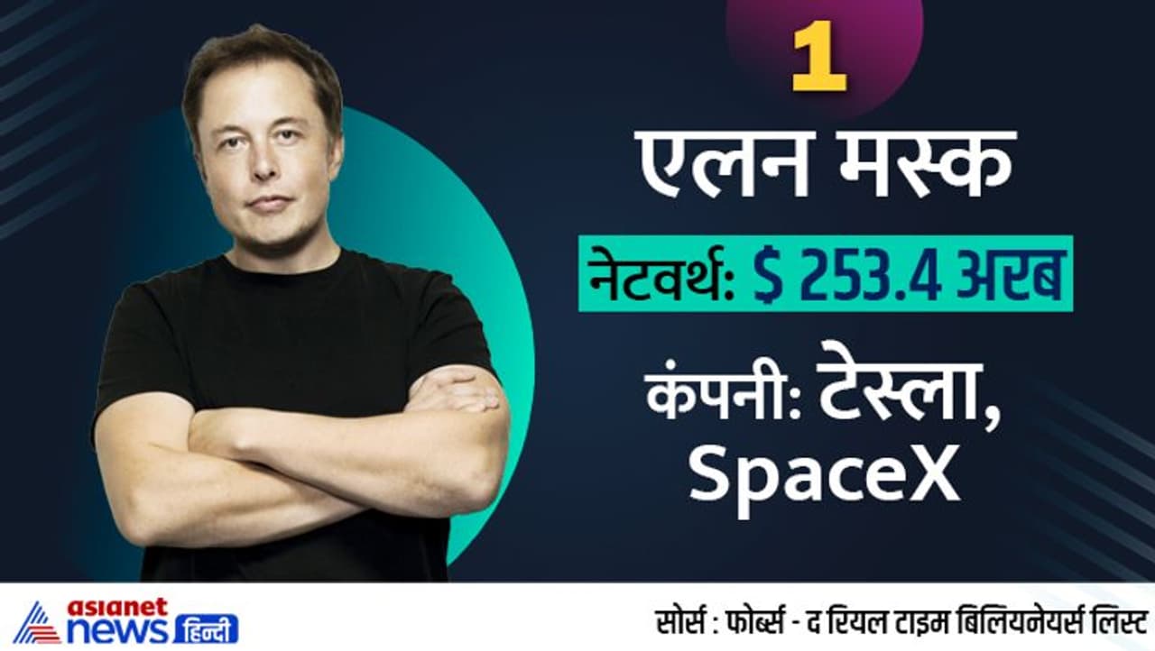 एलन मस्क आज के समय में दुनिया के सबसे अमीर शख्स हैं। उनकी कुल संपत्ति 253.4 बिलियन डॉलर है। एलन मस्क टेस्ला के मालिक हैं, जो इलेक्ट्रिक कार बनाती है। इसके अलावा इनकी दूसरी कंपनी स्पेस एक्स है, जो कि अंतरिक्ष में लोगों को भेजने के साथ ही स्पेस यात्रा को और आसान बनाने के लिए लगातार काम कर रही है।