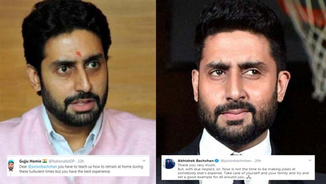 इसके जवाब में अभिषेक बच्चन ने लिखा-'बहुत-बहुत शुक्रिया। लेकिन सर बड़े सम्मान के साथ कहना चाहता हूं कि यह वक्त किसी और को टारगेट करके मजाक बनाने का नहीं है। अपना और अपने परिवार का ध्यान रखें और आसपास के लोगों के लिए सही उदाहरण सेट करें।'