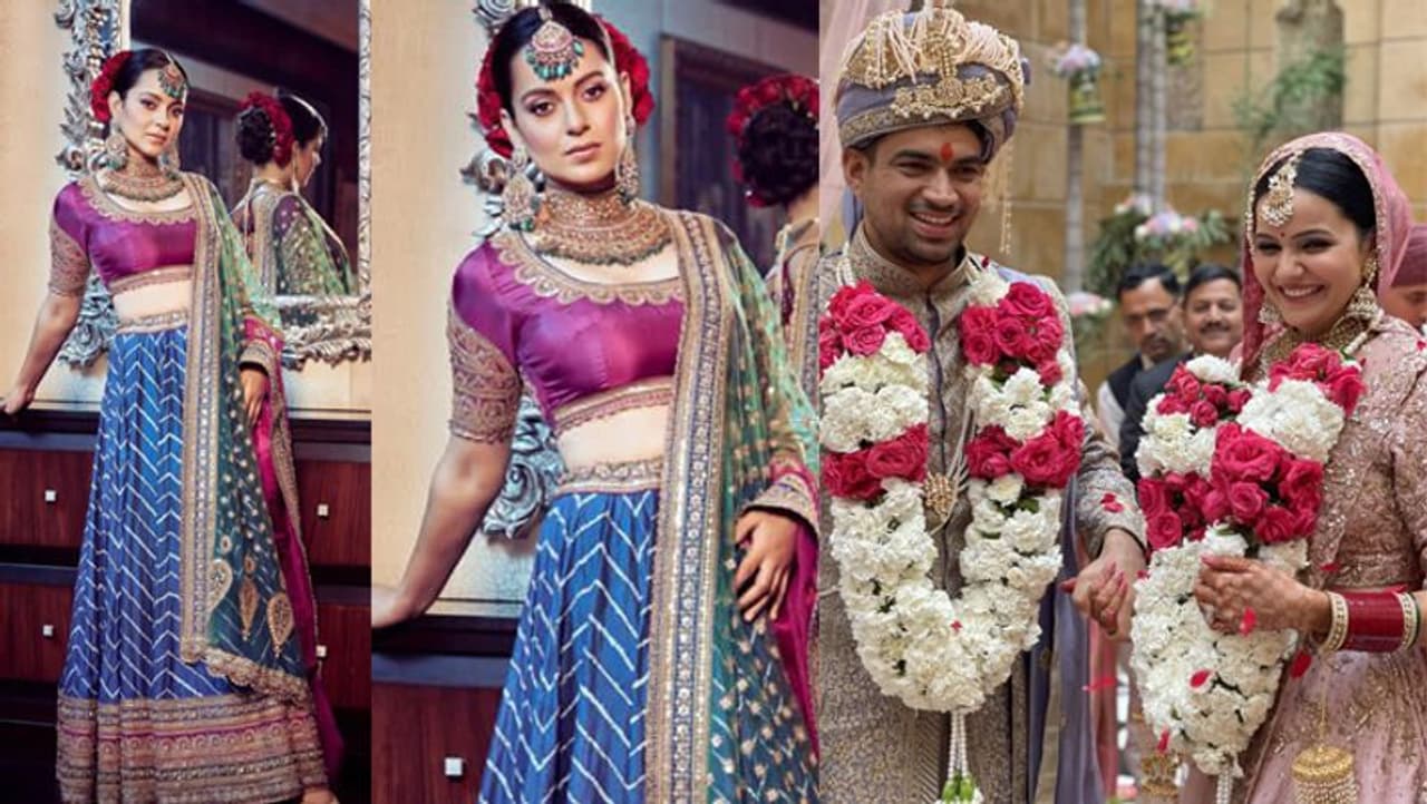 राजस्थान में हुई इस शाही शादी में कंगना ने गोल्डन एम्ब्रॉयडरी वाला ब्लू एंड बैगनी कलर के कॉम्बीनेशन का लहंगा पहना। इसके साथ उन्होंने ग्रीन कलर का दुपट्टा कैरी किया था। कंगना ने इस लुक को फुल हैवी ज्वैलरी और बालों में रेड रोज लगाकर पूरा किया।