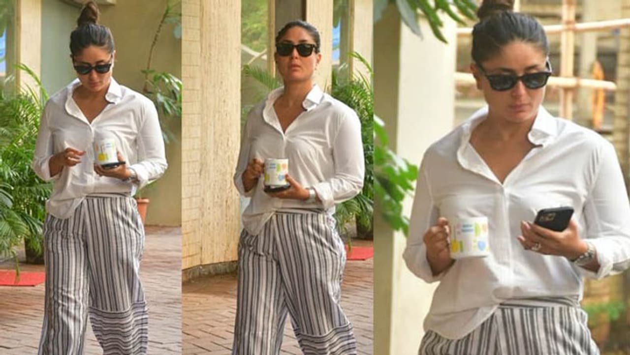सुबह-सुबह हाथ में कॉफी का मग लिए घर से बाहर निकली करीना कपूर ने सफेद रंग की शर्ट और धारीधार पैंट पहन रखी है। उनके बाल अजीब से बंधे नजर आ रहे हैं। इस दौरान वे मोबाइल में बिजी नजर आई।