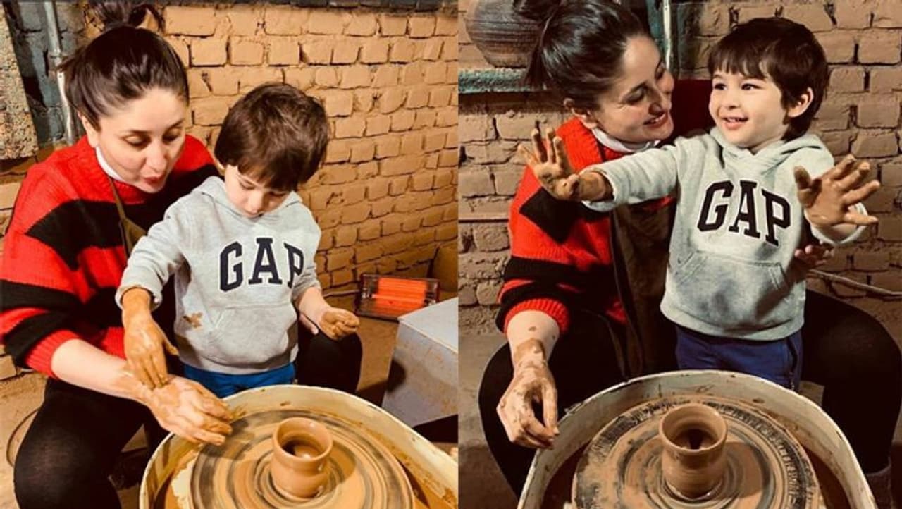 सामने आई फोटोज में करीना और तैमूर दोनों के हाथों में गिली मिट्टी लगी है और दोनों ही पॉट बनाने की कोशिश कर रहे हैं।