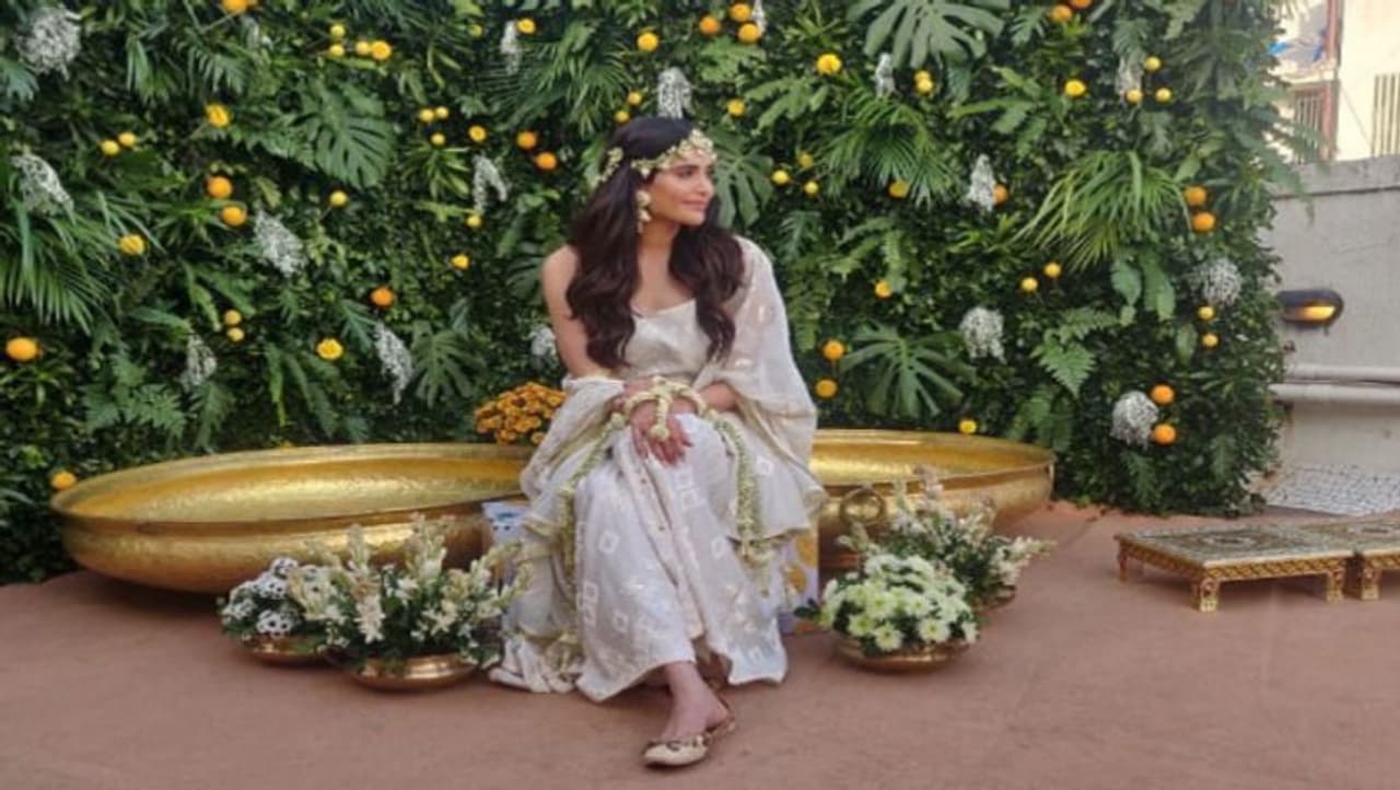 आमतौर पर जहां लोग हल्दी की रस्म के लिए पीला आउटफिट चुनते हैं, वहीं करिश्मा तन्ना ने अपने इस फंक्शन के लिए  व्हाइट और गोल्डन कलर का सूट चुना। वो इस सूट के साथ फ्लावर ज्वेलरी पहनी नजर आईं।