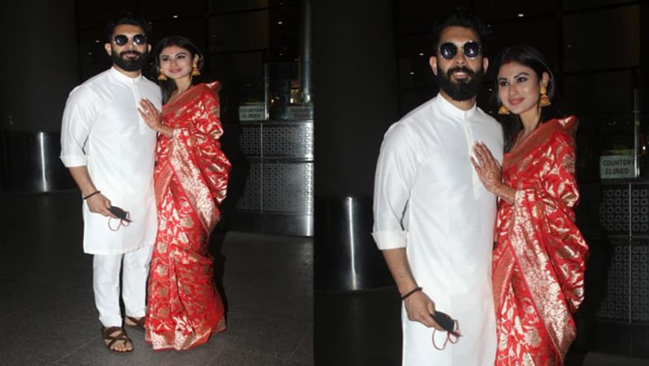 लाल बनारसी साड़ी और सिंदूर में Mouni Roy लौटीं मुंबई, पति सूरज नांबियार के साथ लिपट कर दिया पोज