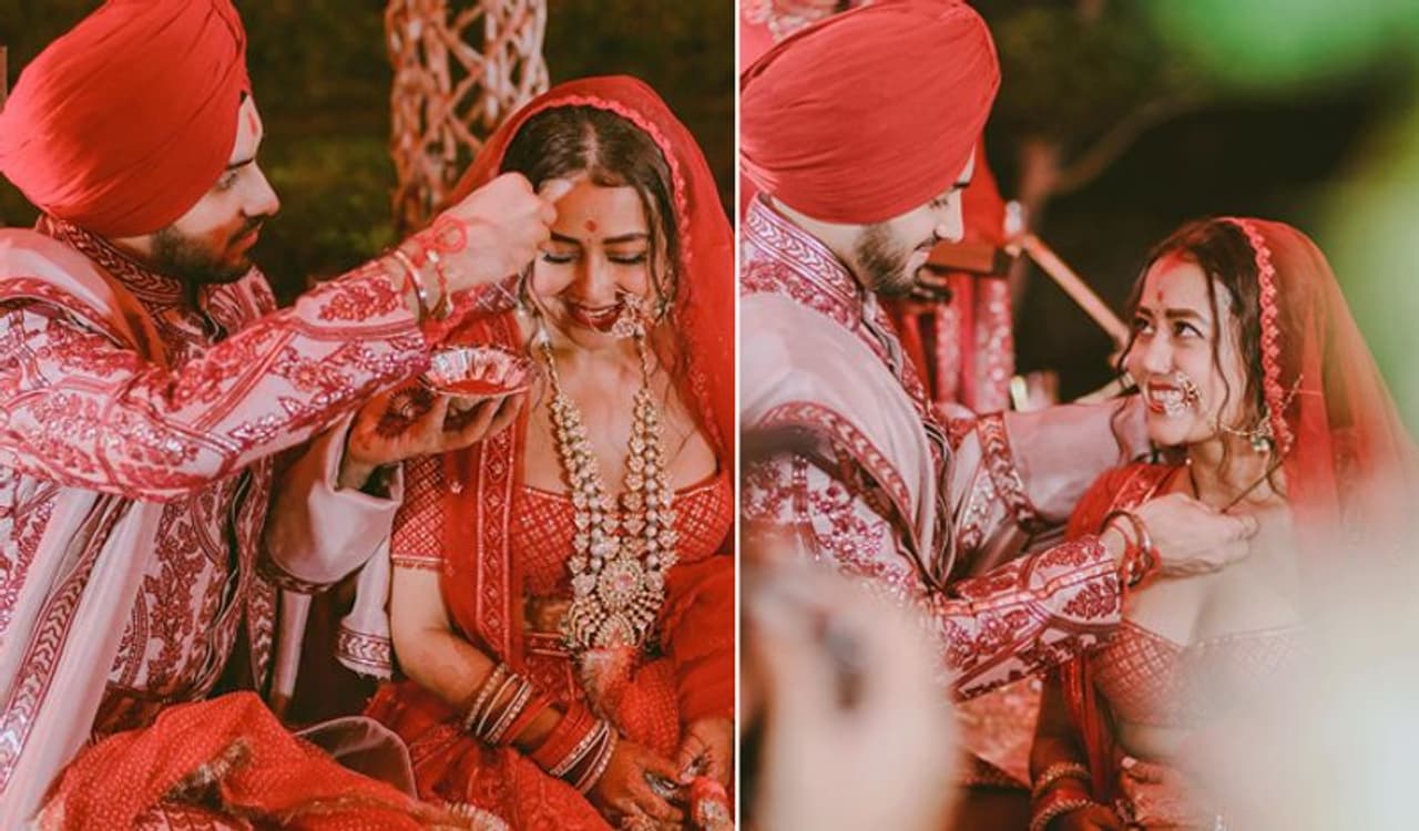 नेहा कक्कड़ ने पति रोहनप्रीत के साथ शादी की नई फोटोज शेयर की है। इन तस्वीरों में रोहन नेहा को मांग में सिंदूर लगाते दिख रहे हैं और जैसे ही सिंगर नेहा को सिंदूर लगाने के लिए हाथ आगे बढ़ाते हैं तो वो शर्म से लाल हो जाती हैं, जो कि इन तस्वीरों में देखने के लिए मिल रहा है।
