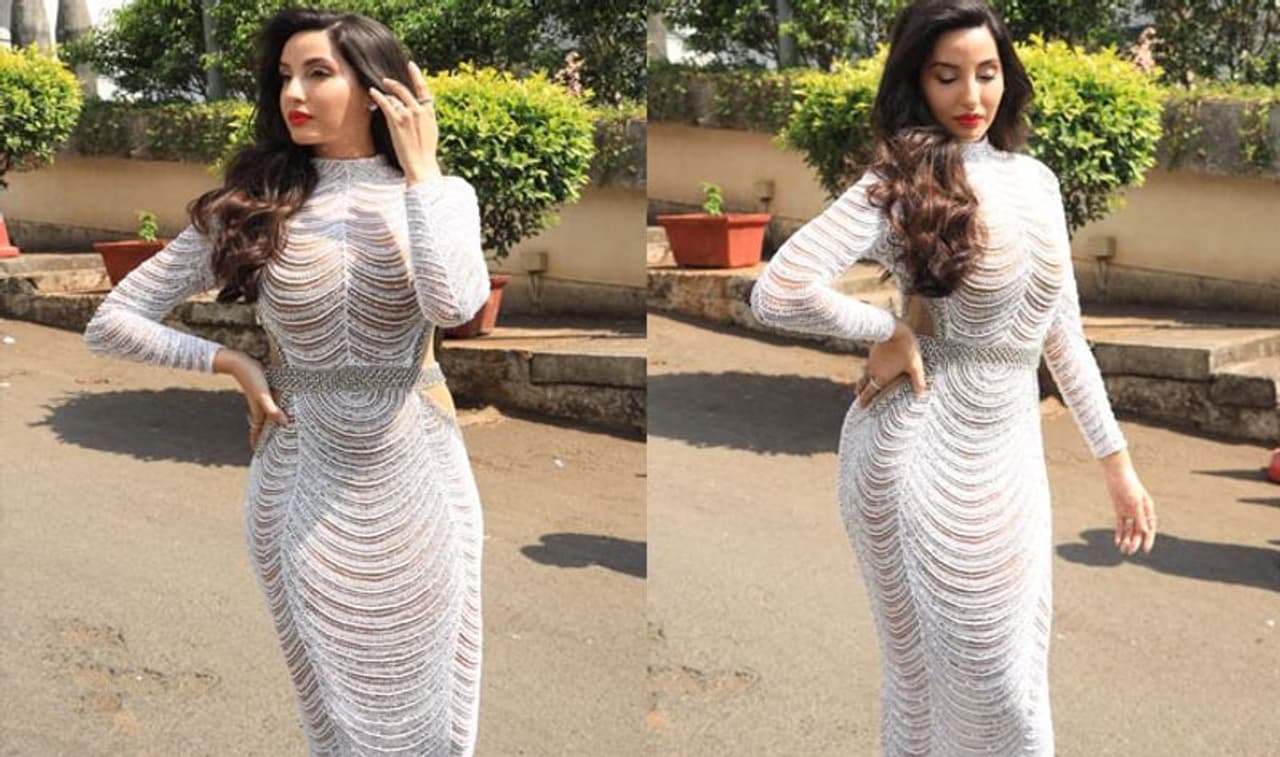 नोरा फतेही को बेहद ही यूनिक आउटफिट में पैपराजी ने कैमरे में कैद किया।उनके आउटफिट को व्हाइट मोती और नग से मिलाकर बनाया गया था।